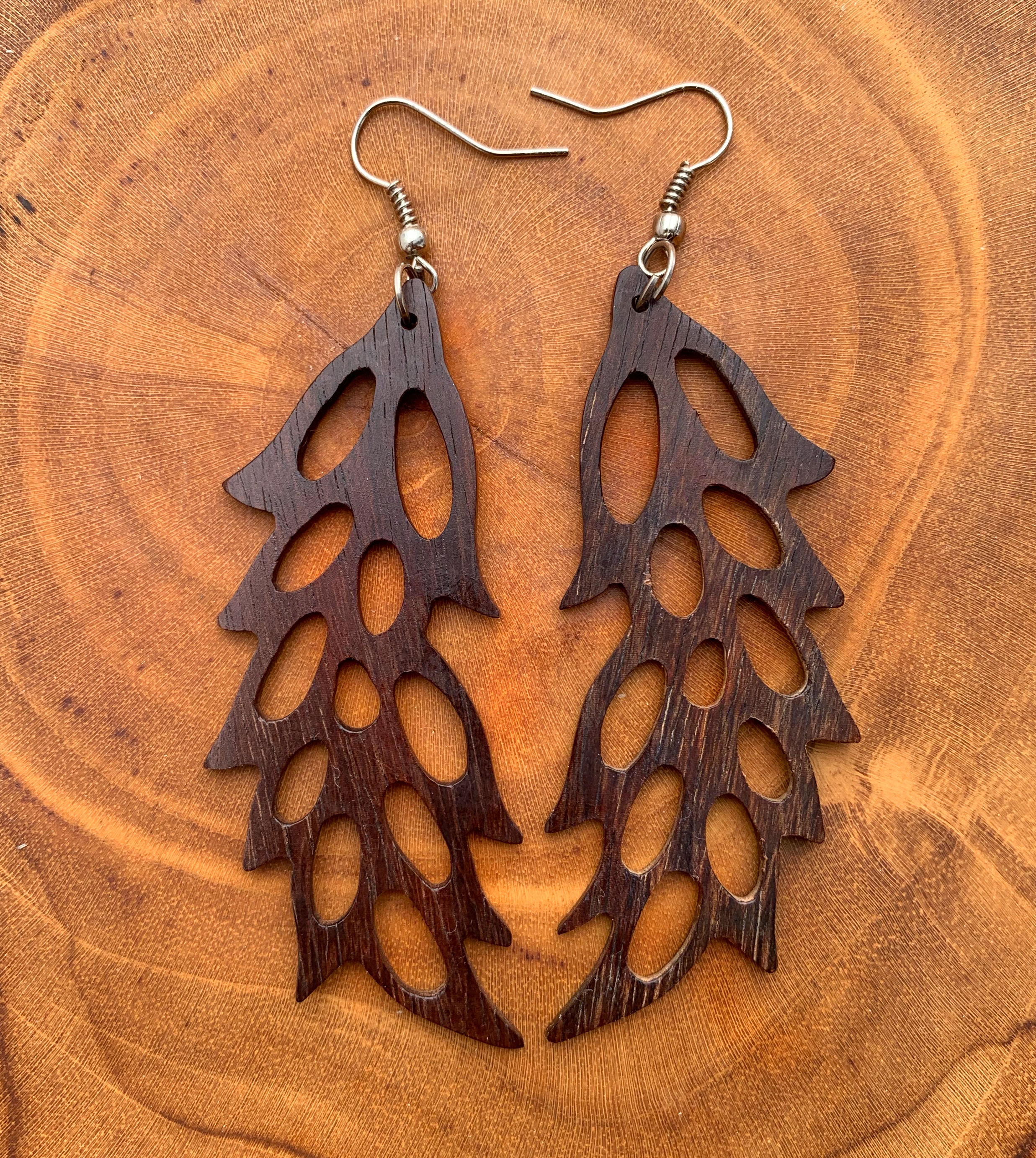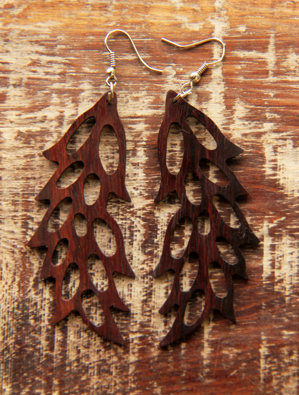 Dokonale ručně zpracované náušnice z lehkého tmavohnědého tropického dřeva s bižuterním háčkem.