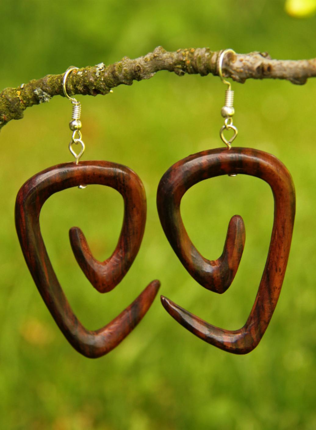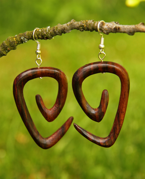 Náušnice z lehkého tropického dřeva s originálním designem v tmavěhnědém přírodním odstínu. Vhodné pro klasickou dírku v uchu.