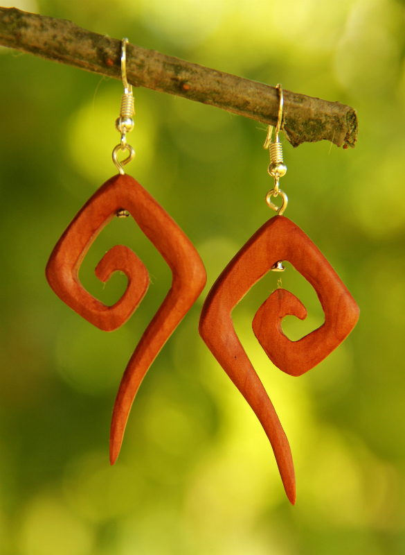 Náušnice z lehkého tropického dřeva s originálním designem v medovém přírodním odstínu. Vhodné pro klasickou dírku v uchu.