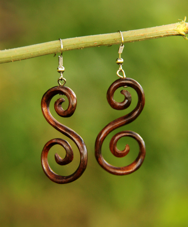 Náušnice z lehkého tropického dřeva s originálním designem v přírodním tmavěhnědém odstínu. Vhodné pro klasickou dírku v uchu.