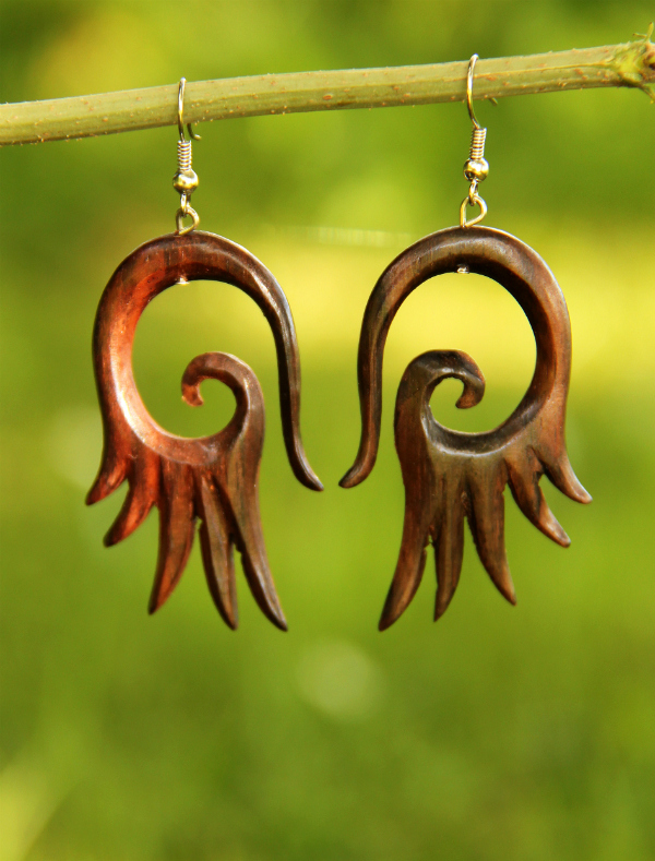 Náušnice z lehkého tropického dřeva s originálním designem v přírodním tmavěhnědém odstínu. Vhodné pro klasickou dírku v uchu.