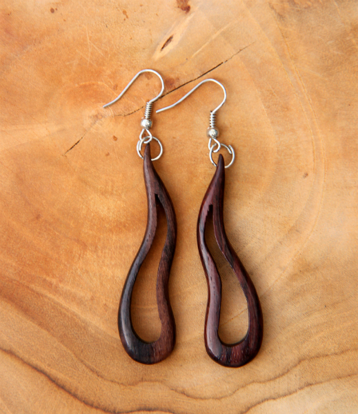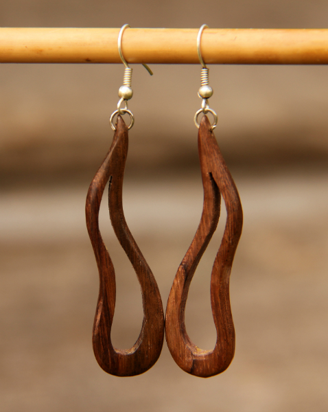 Dokonale ručně zpracované náušnice z lehkého tmavohnědého tropického dřeva s bižuterním háčkem.