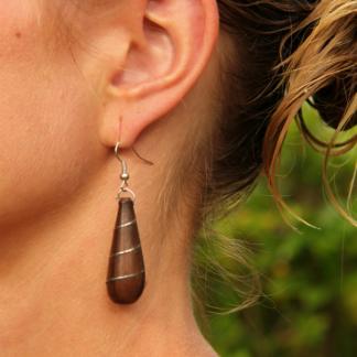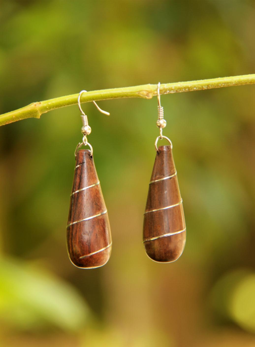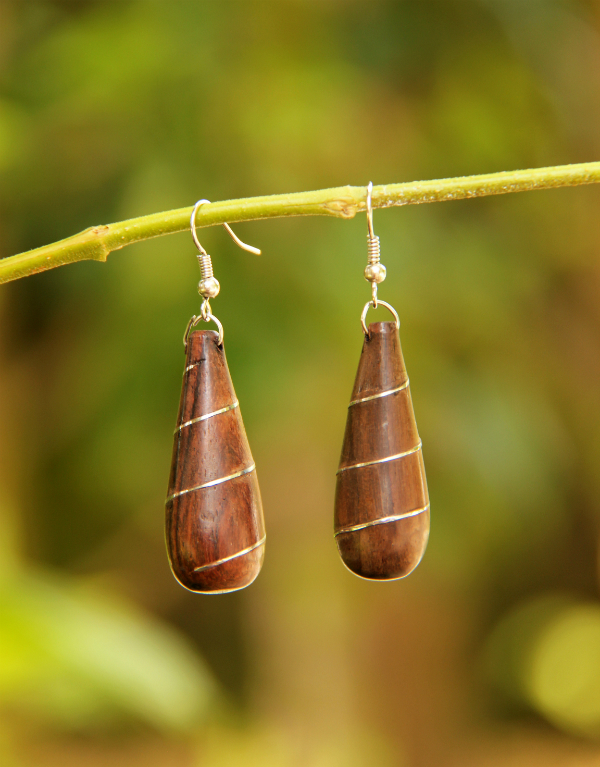 Originální náušnice z lehkoučkého tropického dřeva s kovovou ozdobou.