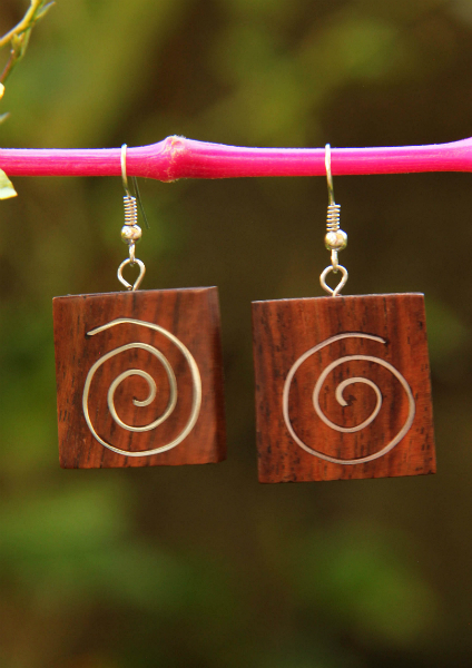 Originální náušnice z lehkoučkého tropického dřeva s kovovou ozdobou.