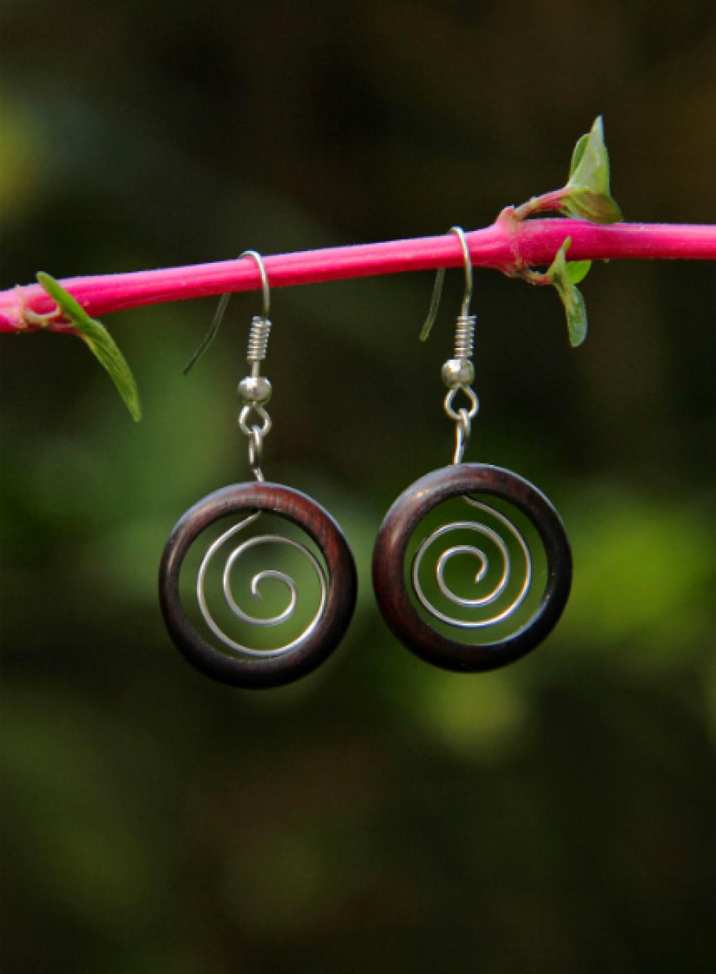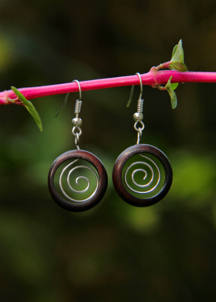 Náušnice z lehkého tropického dřeva s originálním designem v přírodním tmavěhnědém odstínu s kovovou spirálkou ve svém středu. Vhodné pro klasickou dírku v uchu.