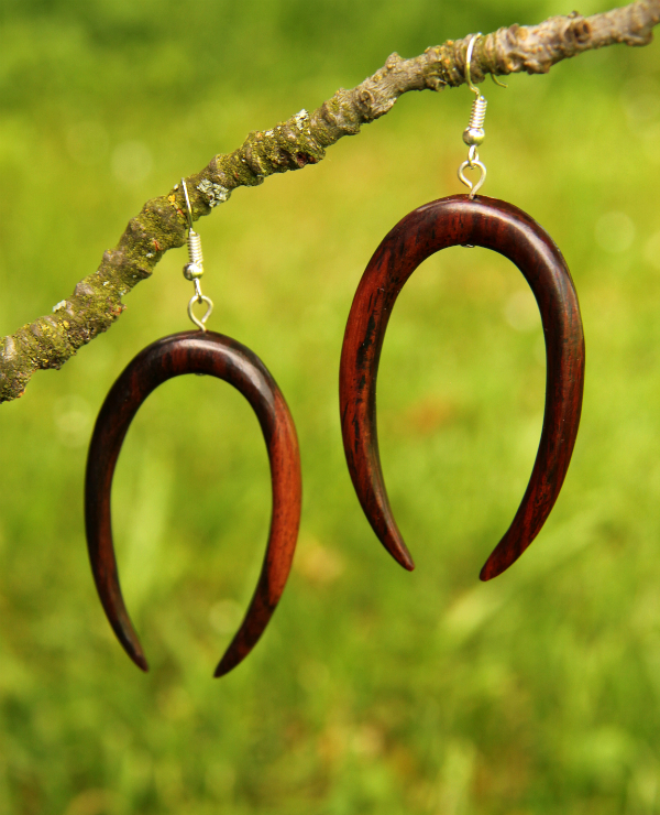 Náušnice z lehkého tropického dřeva s originálním designem v tmavohnědém přírodním odstínu. Vhodné pro klasickou dírku v uchu.