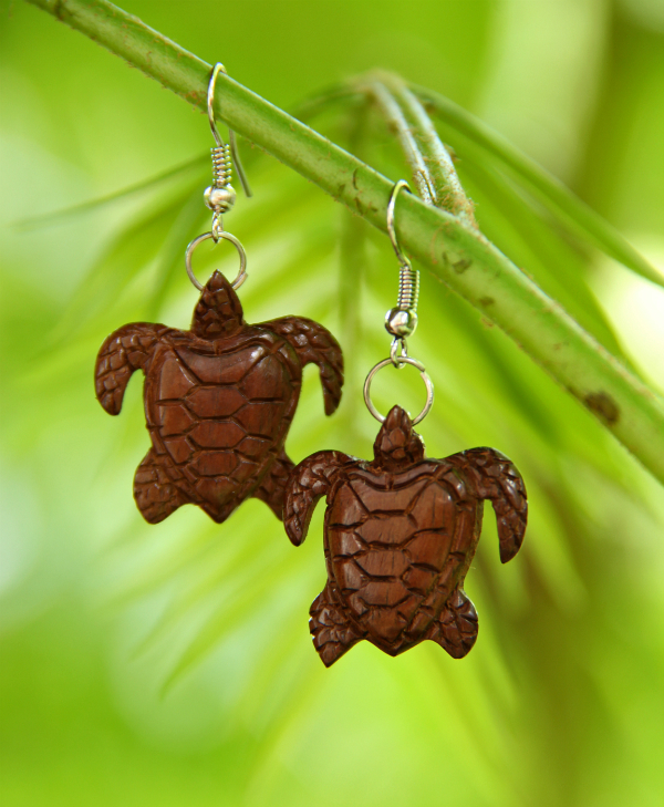 Dokonale ručně zpracované náušnice z lehkého tmavohnědého tropického dřeva s bižuterním háčkem. 3D design želvičky.