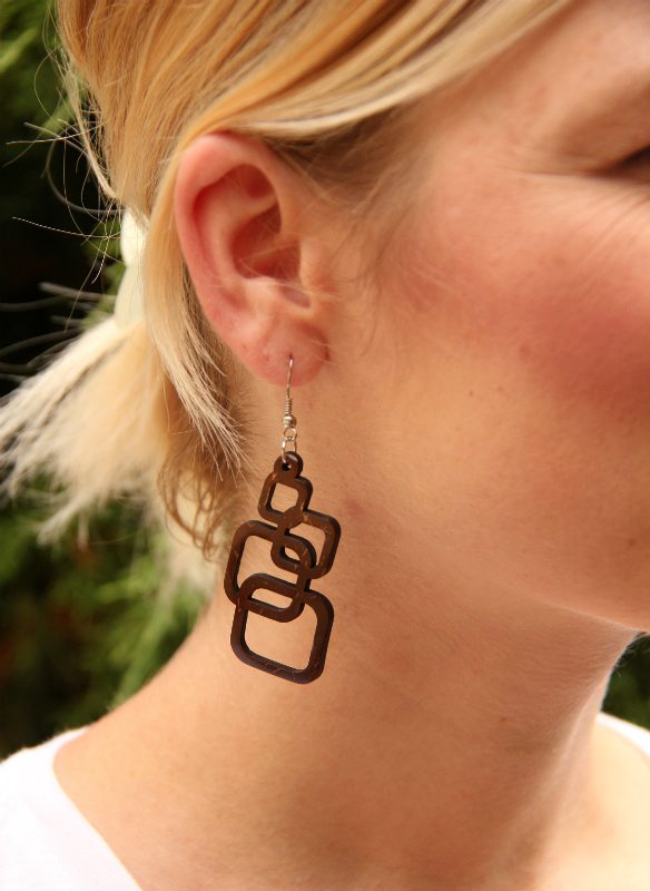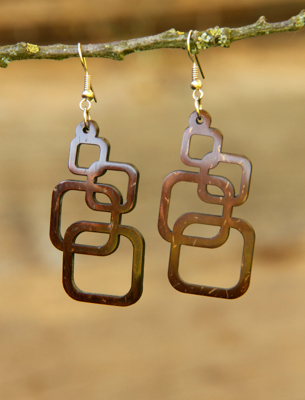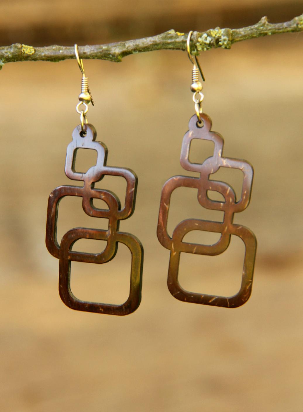 Luxusní náušnice s geometrickým motivem vyrobené z dřevnaté slupky kokosového ořechu. Tento materiál je velmi tvrdý a odolný.
