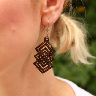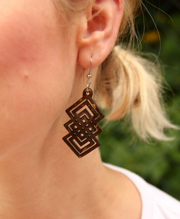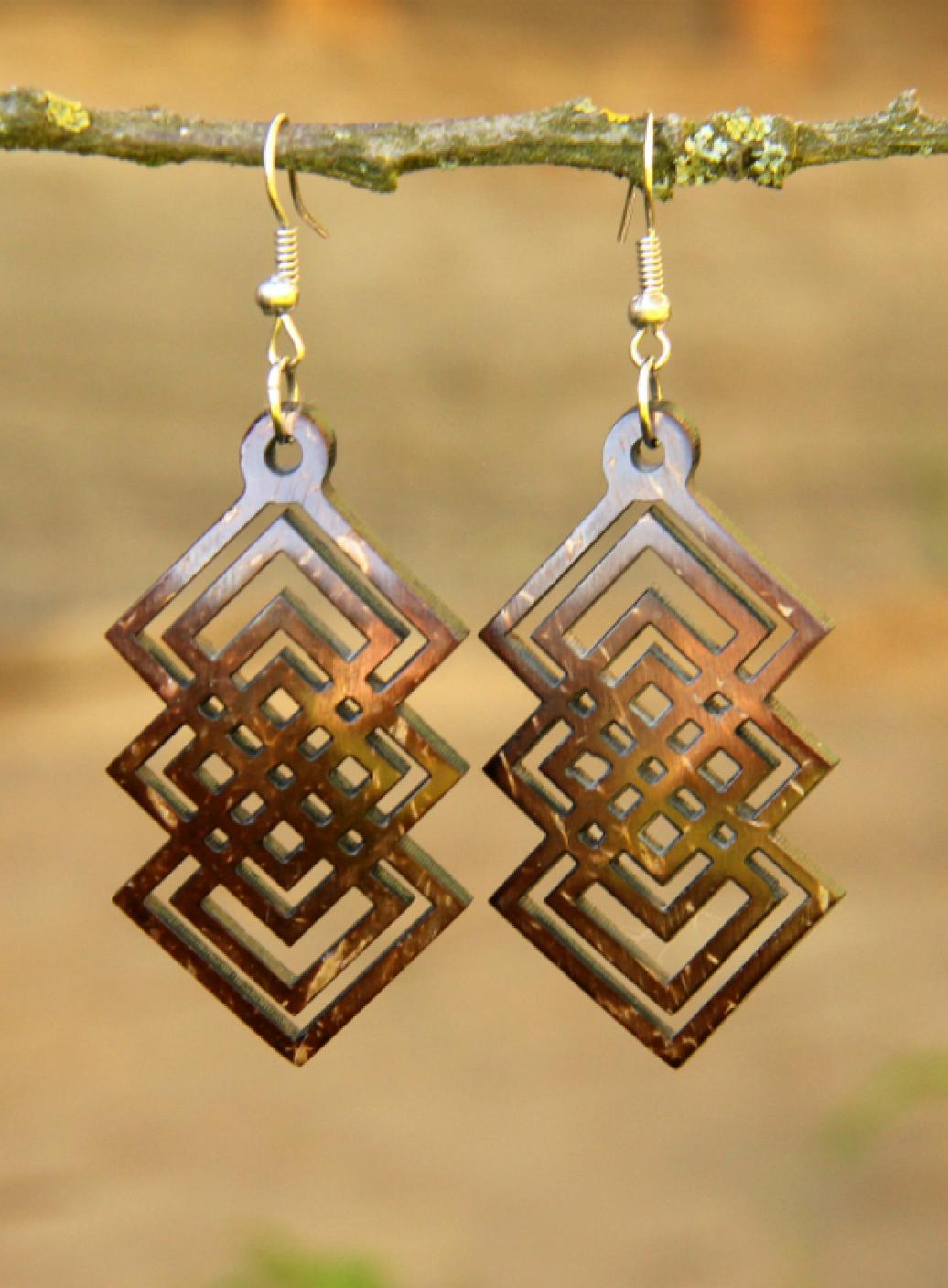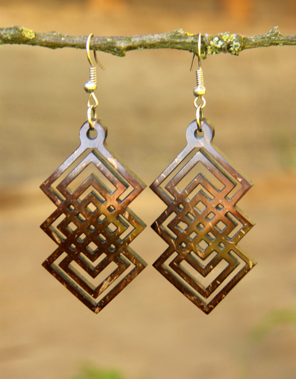 Luxusní náušnice s geometrickým motivem vyrobené z dřevnaté slupky kokosového ořechu. Tento materiál je velmi tvrdý a odolný.