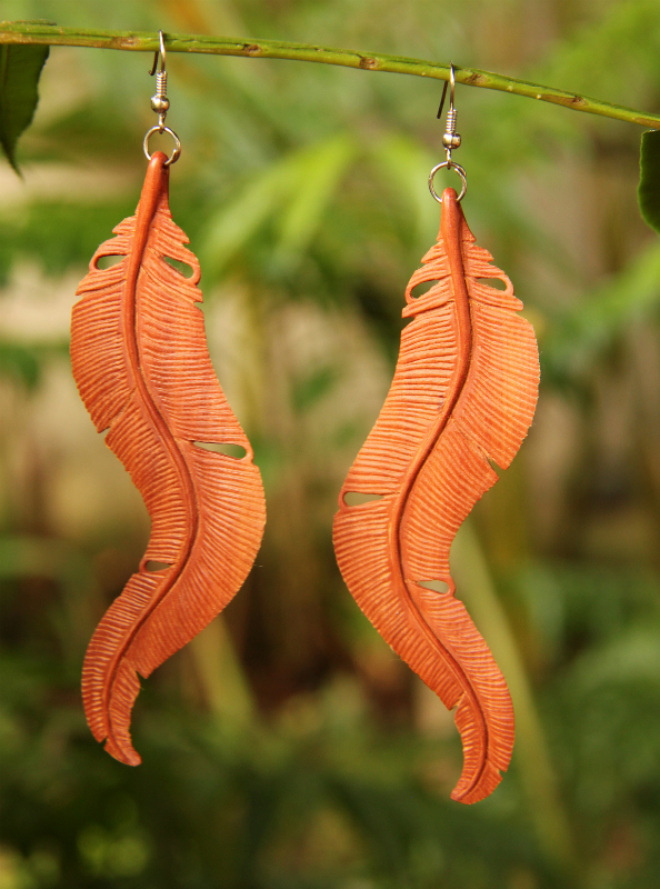 Dokonale ručně zpracované náušnice z lehkého tropického dřeva ve světle hnědém odstínu s bižuterním háčkem ve tvaru pírka.