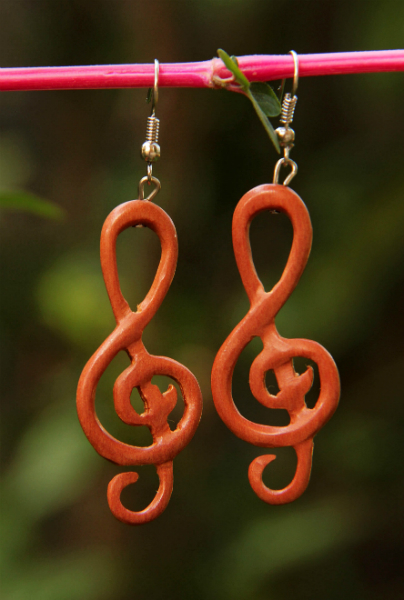 Dokonale ručně zpracované náušnice z lehkého tropického dřeva s bižuterním háčkem. Jemnost, lehkost a krása tropického dřeva v křivkách houslového klíče lahodí oku i duši.