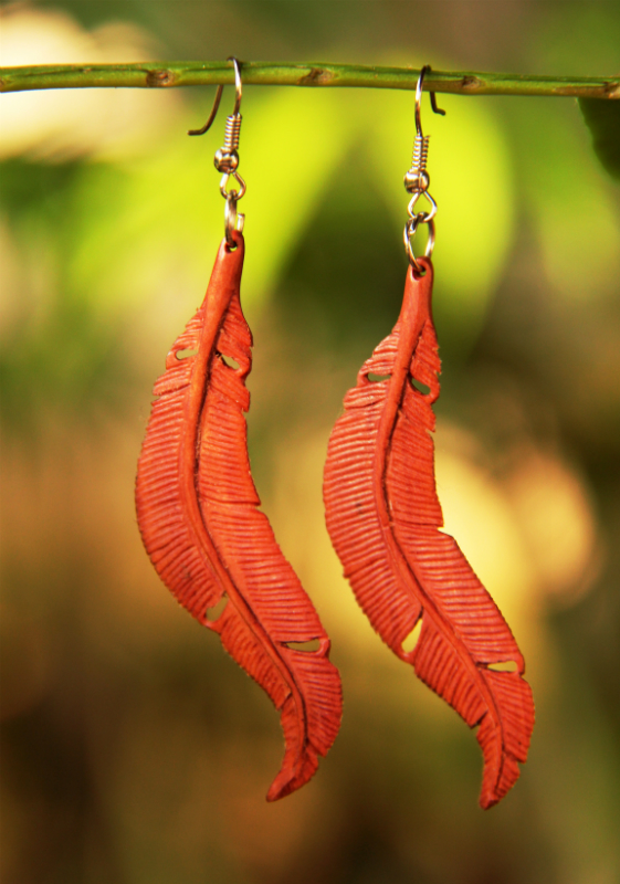 Dokonale ručně zpracované náušnice z lehkého tropického dřeva ve světle hnědém odstínu s bižuterním háčkem ve tvaru pírka.