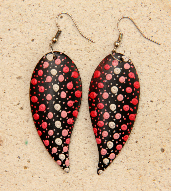 Ručně malované náušnice z lehkého tmavohnědého tropického dřeva s bižuterním háčkem . Délka náušnice 5,5 cm.