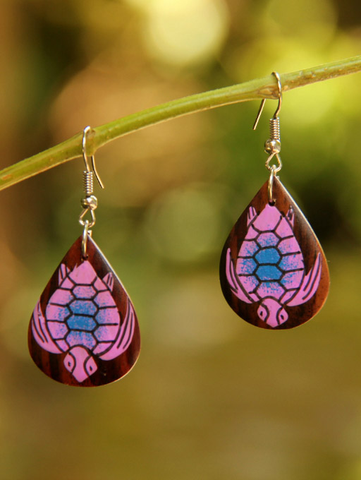 Ručně malované náušnice z lehkého tmavohnědého tropického dřeva s bižuterním háčkem. Délka náušnice 3,5 cm.