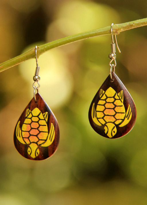 Ručně malované náušnice z lehkého tmavohnědého tropického dřeva s bižuterním háčkem . Délka náušnice 3,5 cm.