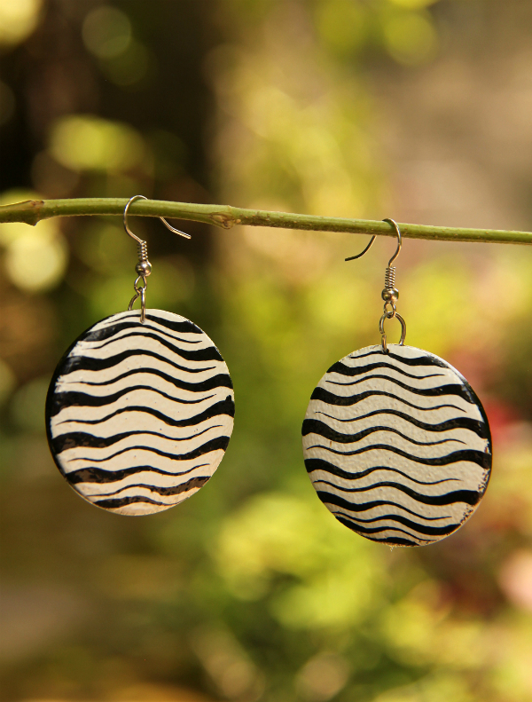 Náušnice z lehkého tropického dřeva v černobílém provedení s bižuterním háčkem, ručně malované.