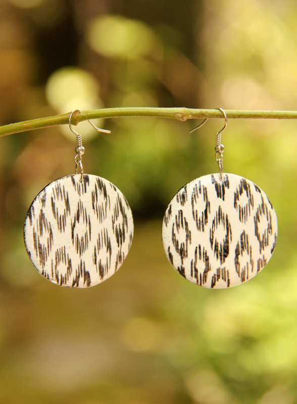 Náušnice z lehkého tropického dřeva v černobílém provedení s bižuterním háčkem, ručně malované.