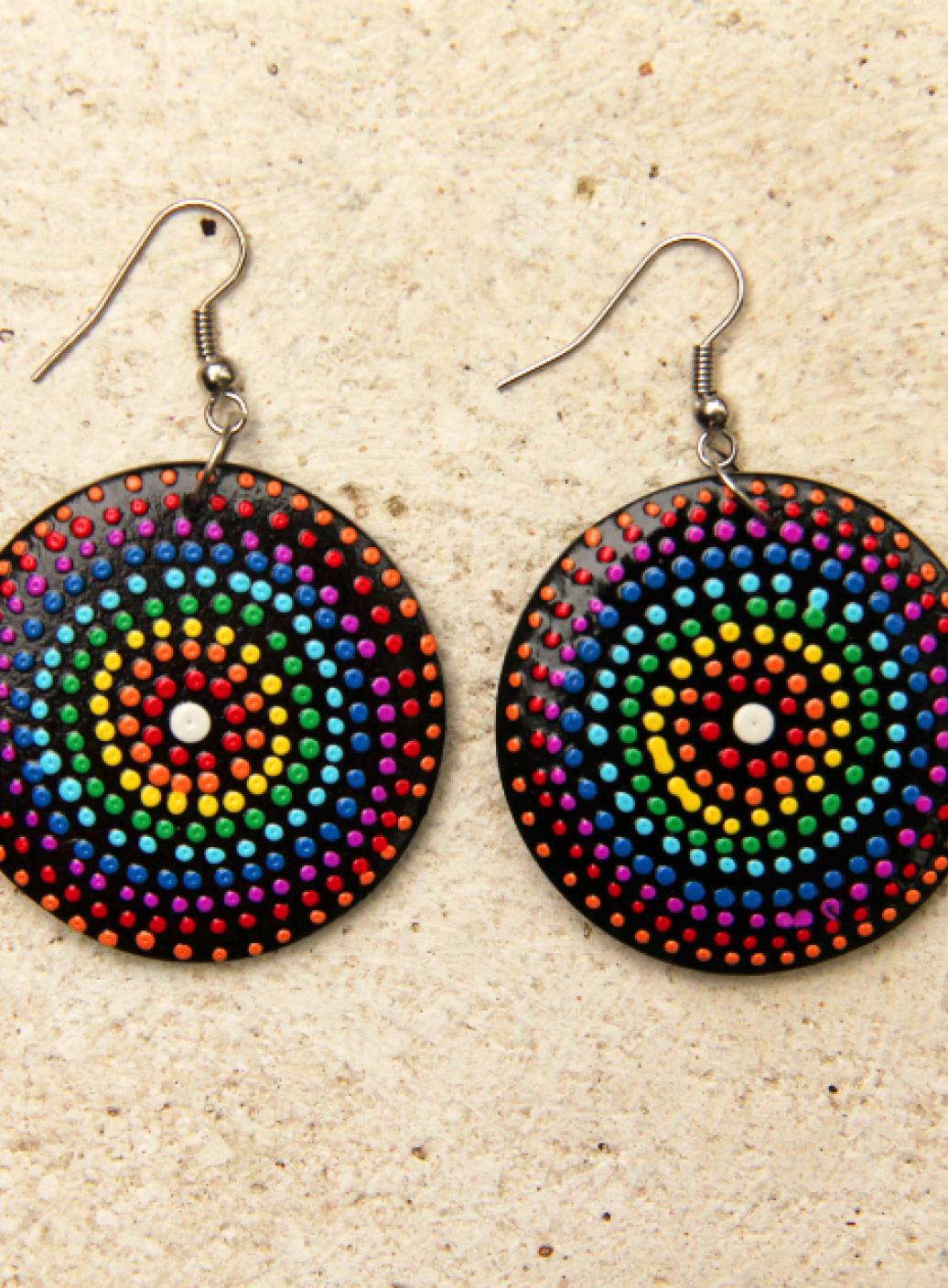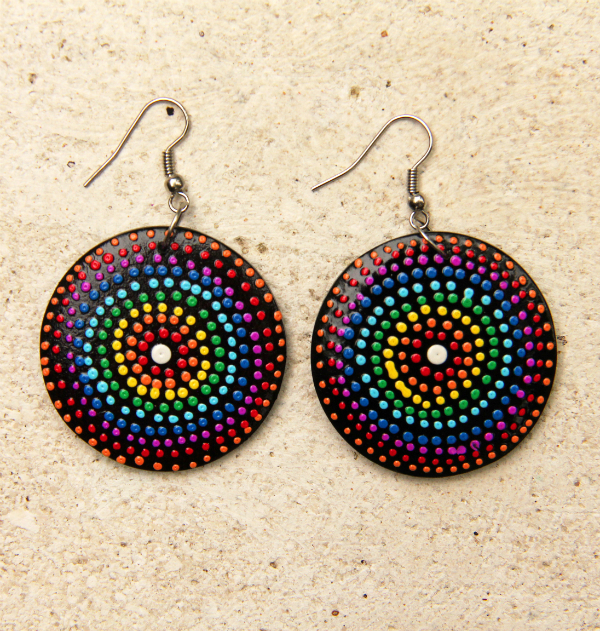 Originální náušnice z lehkého tropického dřeva, ručně malované na černém podkladu.