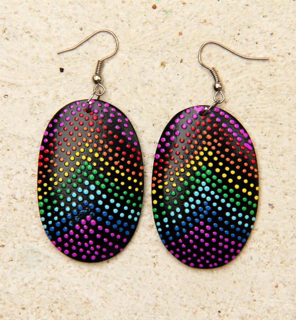 Originální náušnice z lehkého tropického dřeva, ručně malované na černém podkladu.