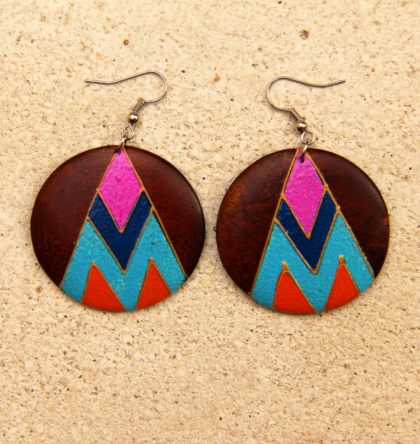 Originální náušnice z lehkého tropického dřeva, ručně malované na přírodně hnědém podkladu.