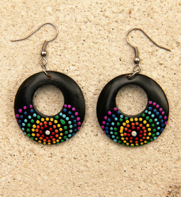 Originální náušnice z lehkého tropického dřeva, ručně malované na černém podkladu.