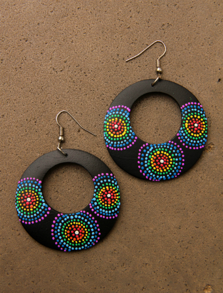 Originální náušnice z lehkého tropického dřeva, ručně malované na černém podkladu.