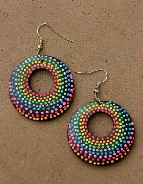 Originální náušnice z lehkého tropického dřeva, ručně malované na černém podkladu.