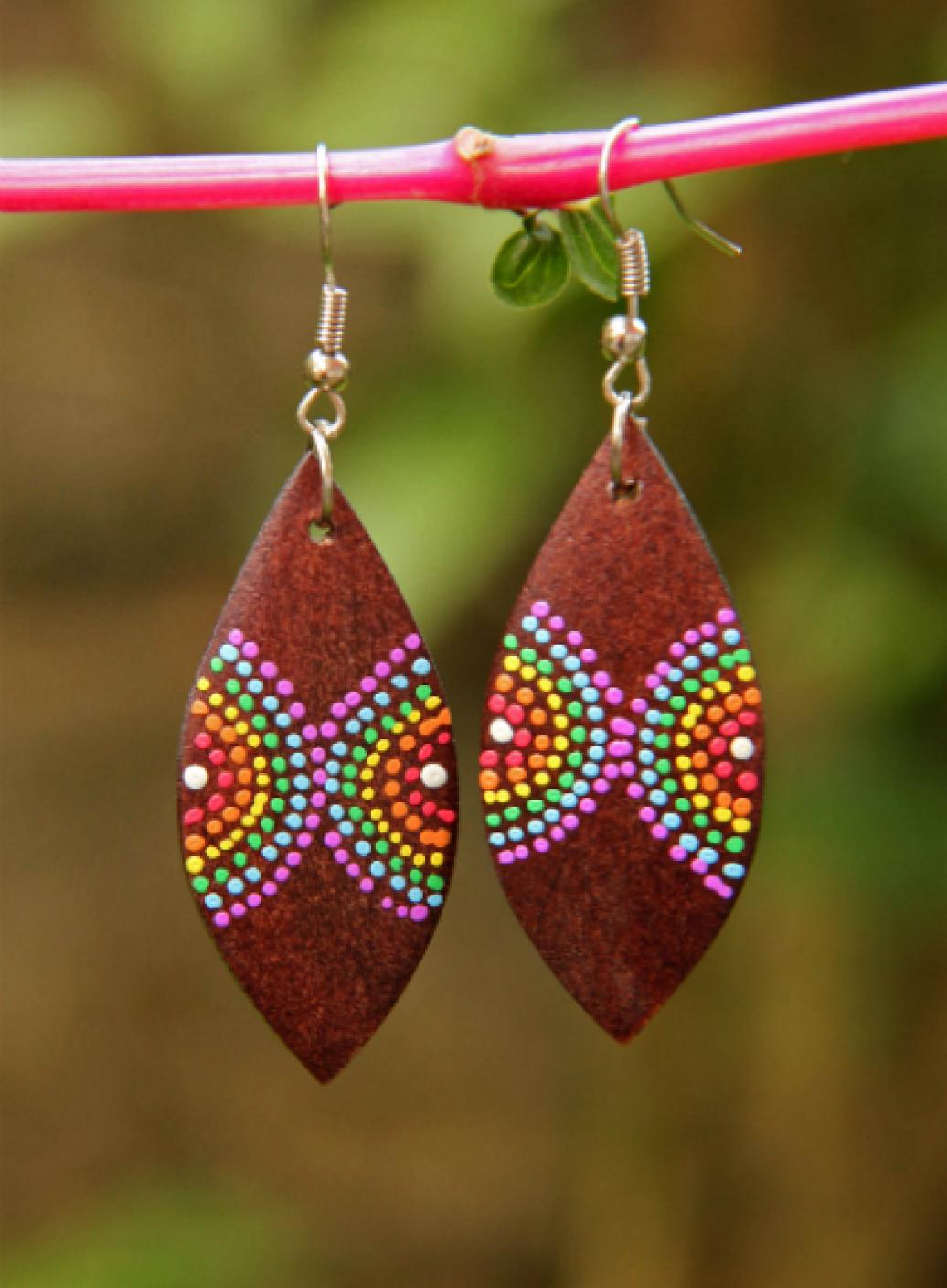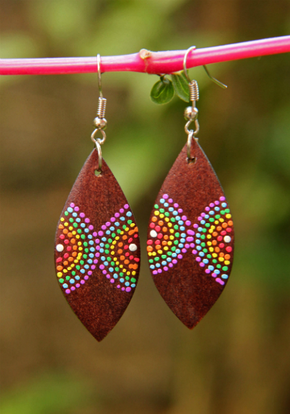 Originální náušnice z lehkého tropického dřeva, ručně malované na tmavěhnědém podkladu.
