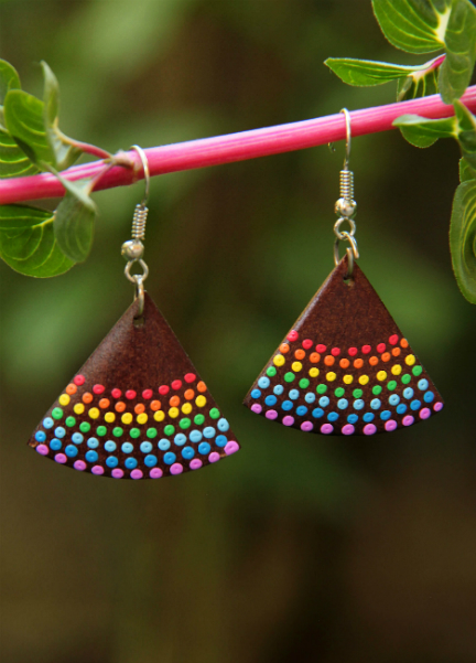 Originální náušnice z lehkého tropického dřeva, ručně malované na tmavěhnědém podkladu.