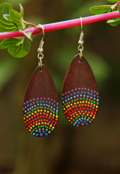 Originální náušnice z lehkého tropického dřeva, ručně malované na tmavěhnědém podkladu.