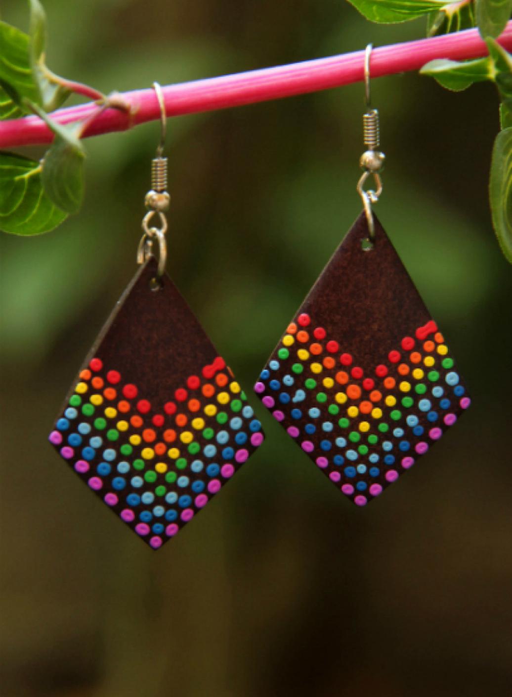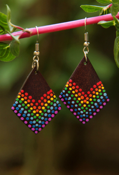 Originální náušnice z lehkého tropického dřeva, ručně malované na tmavěhnědém podkladu.