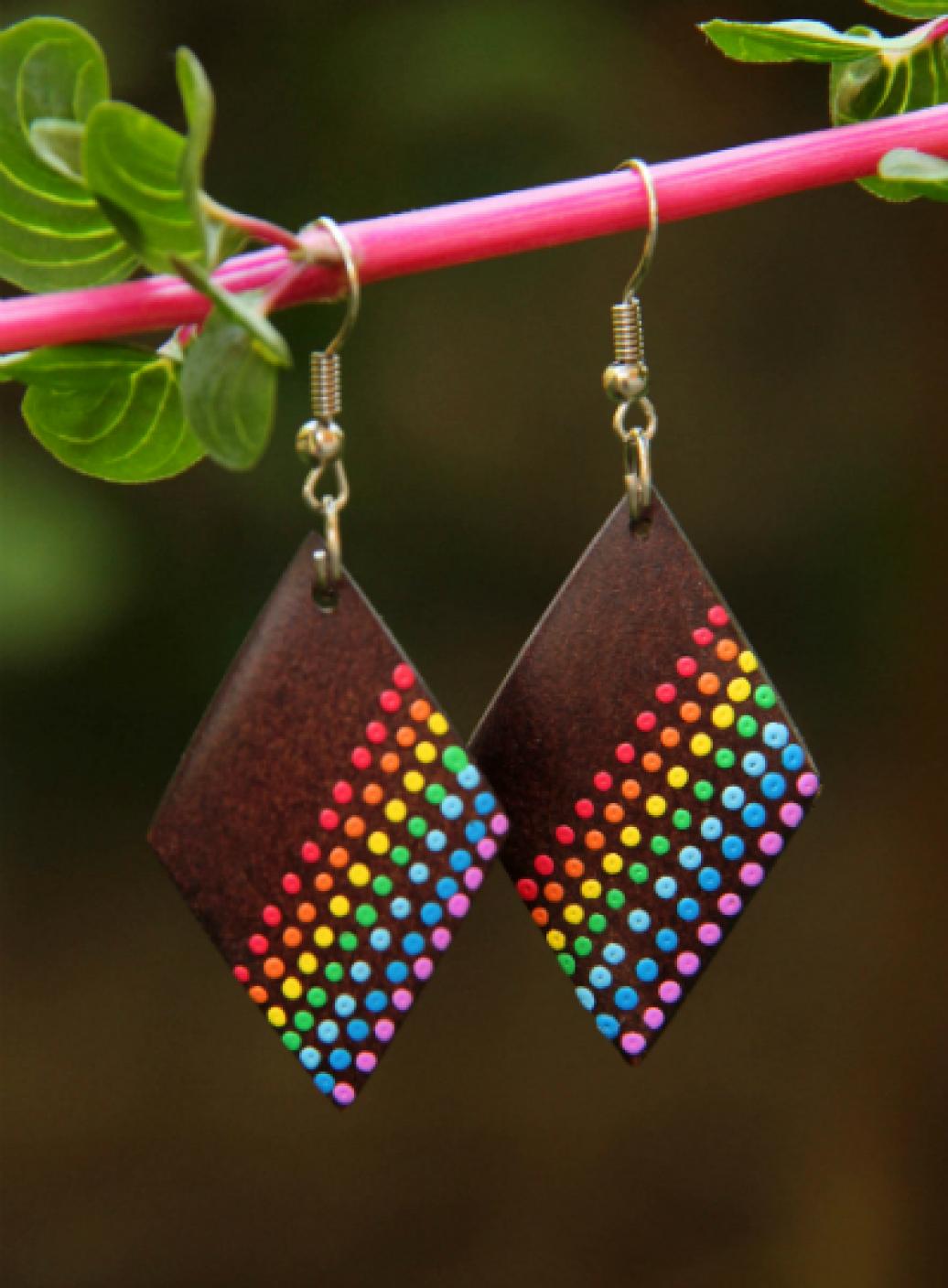 Originální náušnice z lehkého tropického dřeva, ručně malované na tmavěhnědém podkladu.