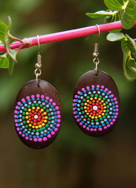 Originální náušnice z lehkého tropického dřeva, ručně malované na tmavěhnědém podkladu.