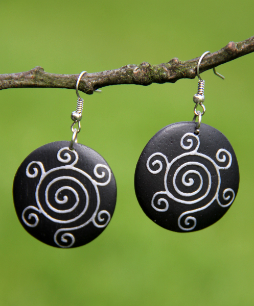 Originální náušnice ze dřeva v černohnědém odstínu, ručně malované stříbrnou barvou.