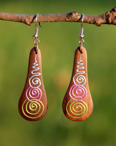Náušnice z lehkého tropického dřeva v přírodně hnědém odstínu s bižuterním háčkem, ručně malované.