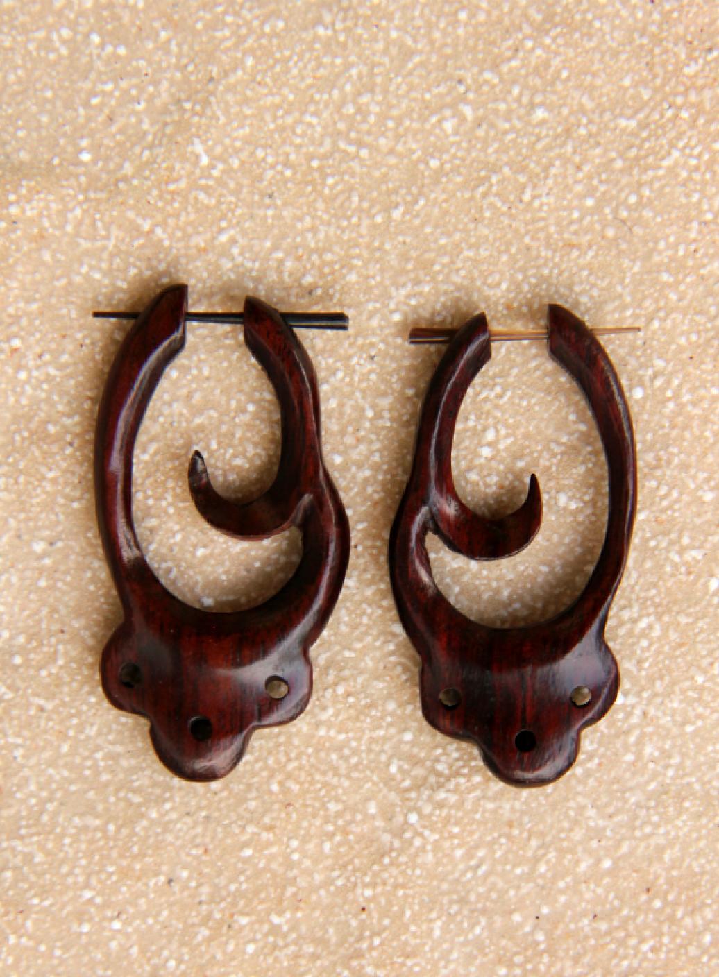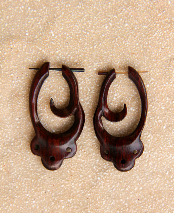 Náušnice z lehkého tropického dřeva s originálním designem a zapínáním na tyčku z pružné a hypoalergenní rohoviny. Vhodné pro klasickou dírku v uchu.