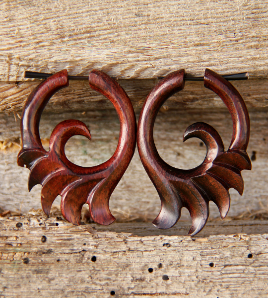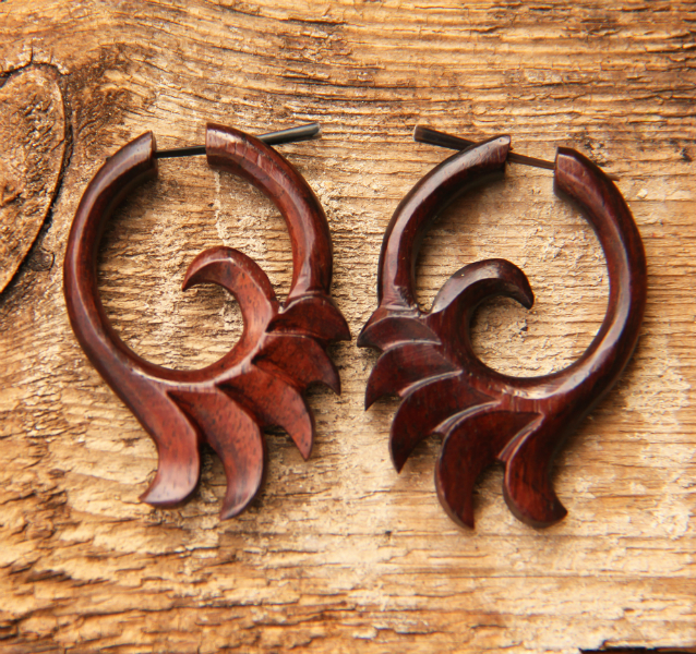 Náušnice z lehkého tropického dřeva s originálním designem a zapínáním na tyčku z pružné a hypoalergenní rohoviny. Vhodné pro klasickou dírku v uchu.