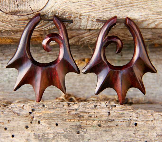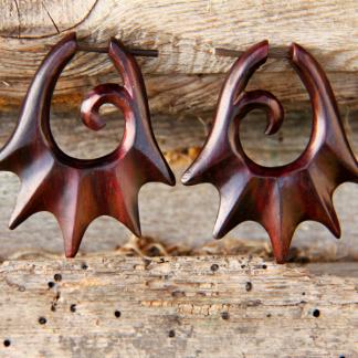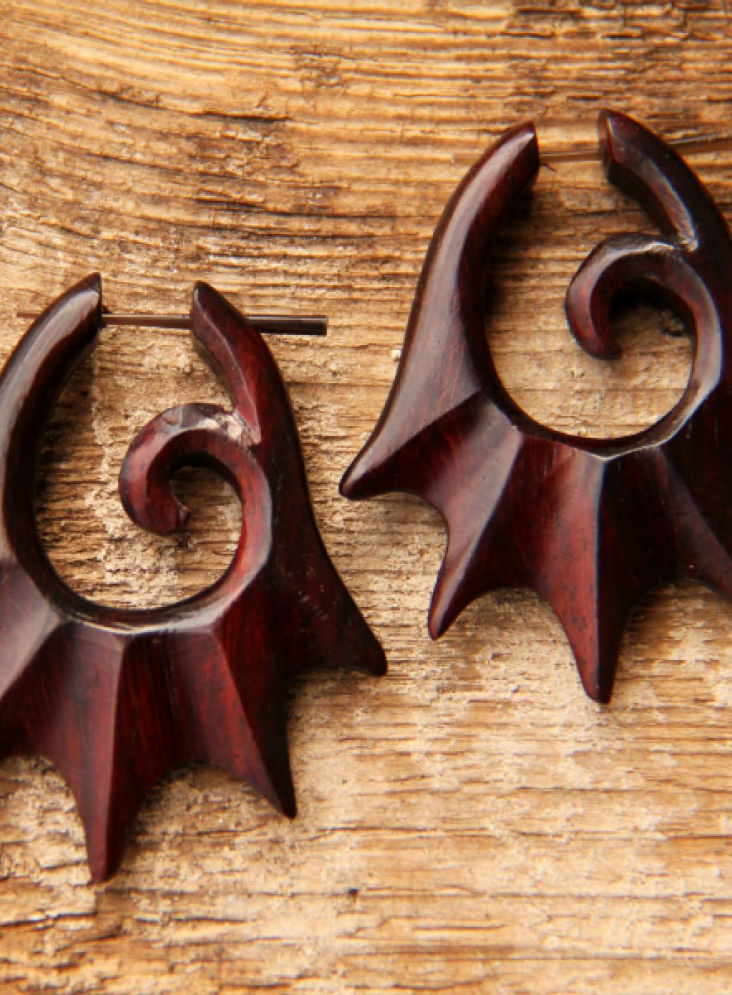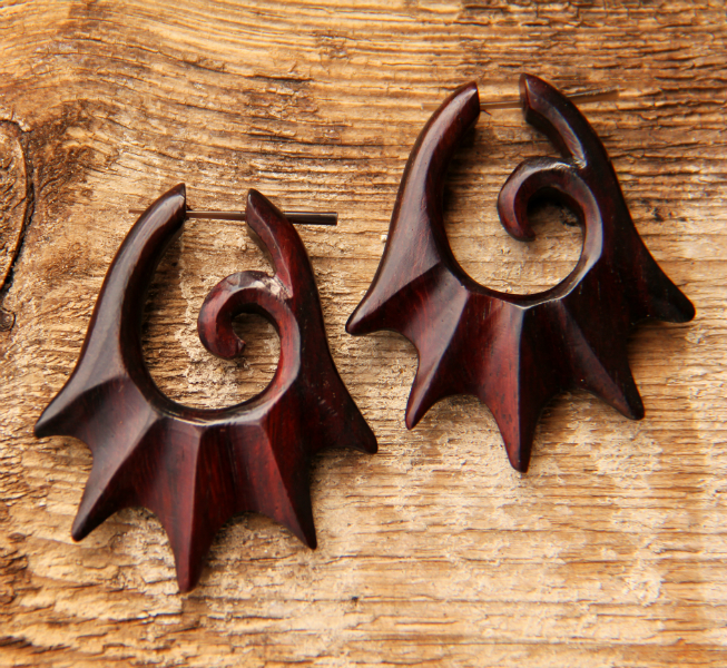 Náušnice z lehkého tropického dřeva s originálním designem a zapínáním na tyčku z pružné a hypoalergenní rohoviny. Vhodné pro klasickou dírku v uchu.