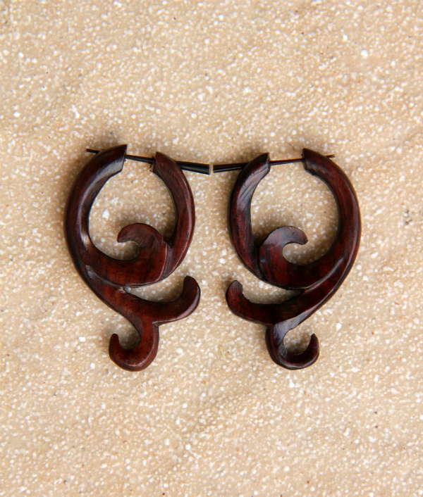Náušnice z lehkého tropického dřeva s originálním designem a zapínáním na tyčku z pružné a hypoalergenní rohoviny. Vhodné pro klasickou dírku v uchu.