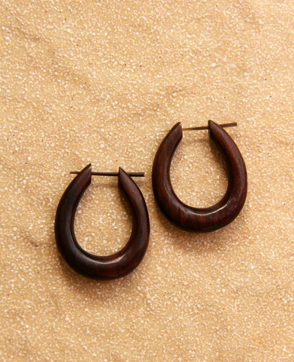 Náušnice z lehkého tropického dřeva s originálním designem a zapínáním na tyčku z pružné a hypoalergenní rohoviny. Vhodné pro klasickou dírku v uchu.