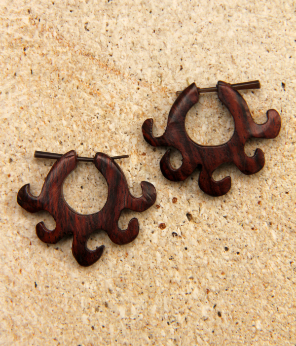 Dřevěné náušnice s originálním designem a zapínáním na tyčku z pružné a hypoalergenní rohoviny. Vhodné pro klasickou dírku v uchu.