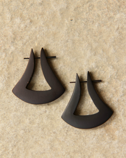 Náušnice z lehkého tropického dřeva s originálním designem a zapínáním na tyčku z pružné a hypoalergenní rohoviny. Vhodné pro klasickou dírku v uchu.