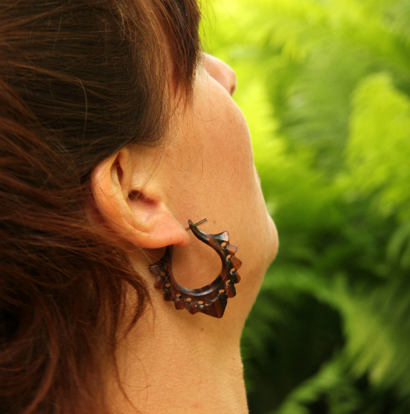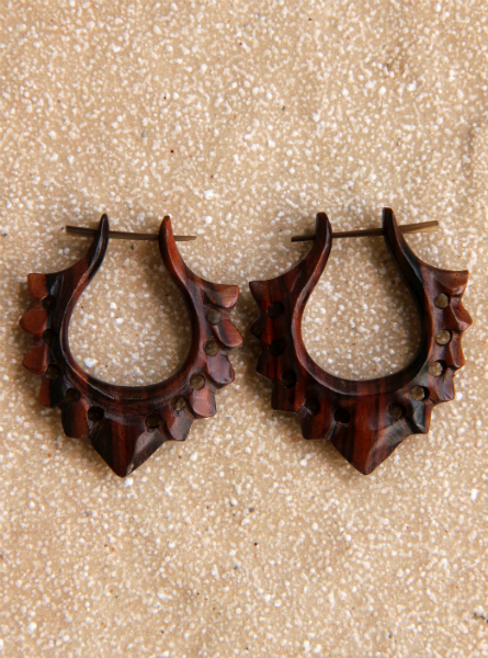 Náušnice z lehkého tropického dřeva s originálním designem a zapínáním na tyčku z pružné a hypoalergenní rohoviny. Vhodné pro klasickou dírku v uchu.