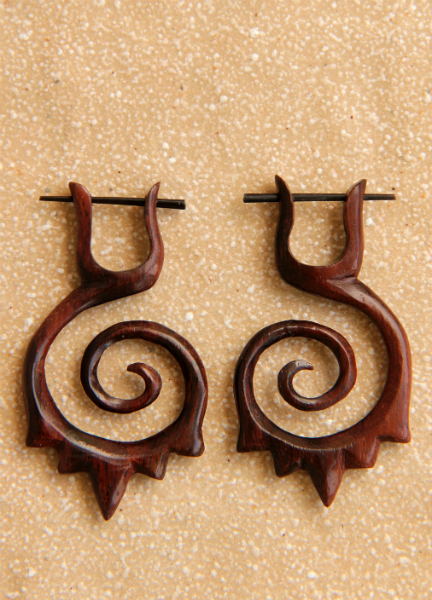 Náušnice z lehkého tropického dřeva s originálním designem a zapínáním na tyčku z pružné a hypoalergenní rohoviny. Vhodné pro klasickou dírku v uchu.