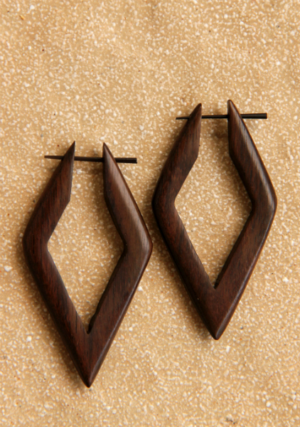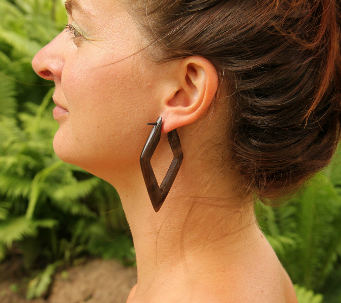 Náušnice z lehkého tropického dřeva s originálním designem a zapínáním na tyčku z pružné a hypoalergenní rohoviny. Vhodné pro klasickou dírku v uchu.