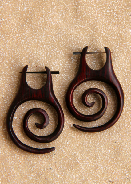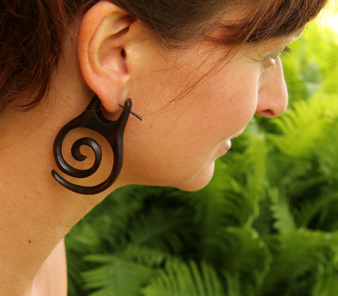 Náušnice z lehkého tropického dřeva s originálním designem a zapínáním na tyčku z pružné a hypoalergenní rohoviny. Vhodné pro klasickou dírku v uchu.
