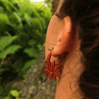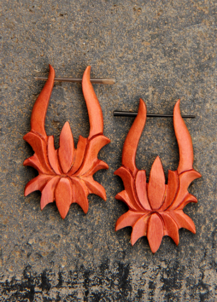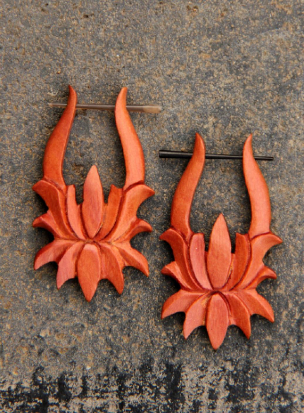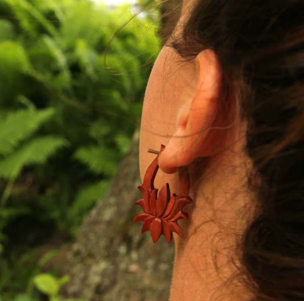 Náušnice z lehkého tropického dřeva s originálním designem a zapínáním na tyčku z pružné a hypoalergenní rohoviny. Vhodné pro klasickou dírku v uchu.