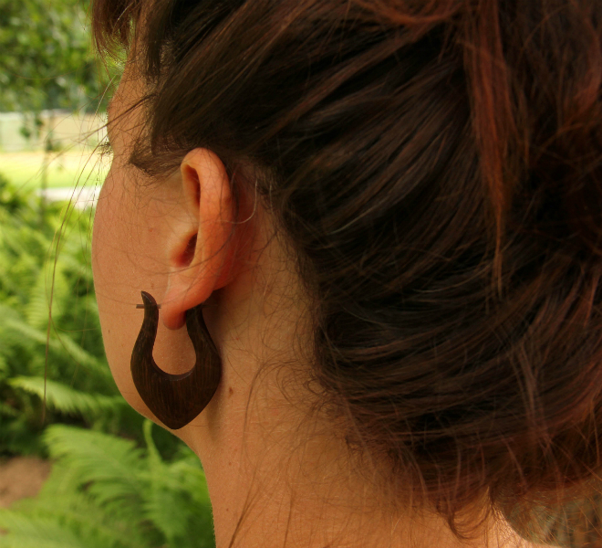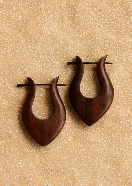 Náušnice z lehkého tropického dřeva s originálním designem a zapínáním na tyčku z pružné a hypoalergenní rohoviny. Vhodné pro klasickou dírku v uchu.