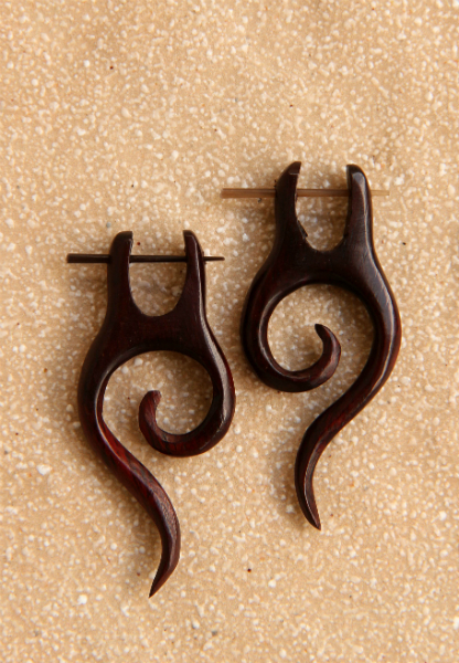 Náušnice z lehkého tropického dřeva s originálním designem a zapínáním na tyčku z pružné a hypoalergenní rohoviny. Vhodné pro klasickou dírku v uchu.