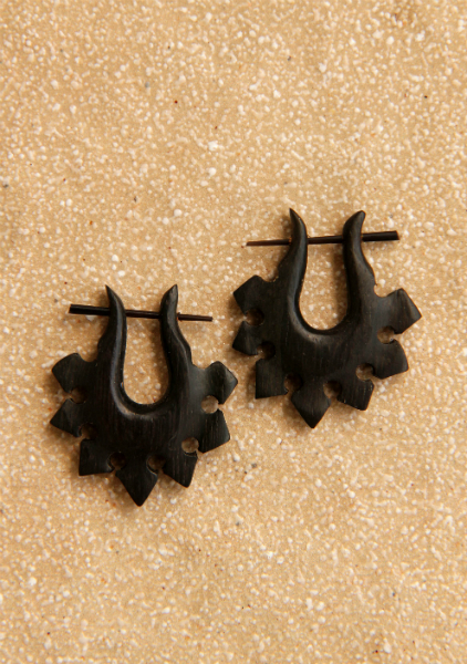 Náušnice z lehkého tropického dřeva s originálním designem a zapínáním na tyčku z pružné a hypoalergenní rohoviny. Vhodné pro klasickou dírku v uchu.